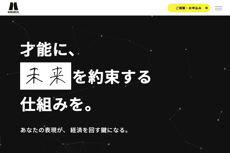 株式会社MAKUREAL様ウェブサイト https://makureal.co.jp千葉県千葉市の幕張にある、株式会社MAKUREAL様のコーポレートサイトを制作いたしました。スポーツ・エンターテイメント、教育福祉、不動産再生など、多岐にわたる事業を行っているMAKUREAL様。それぞれの才能(種)が結ぶイメージを「点」と「線」で表現しました。また、ロゴに合わせた配色を行い、アクセントカラーの黄色は「希望」「つながり」「調和」を込めて使用しております。 Category Web 実績一覧へ戻る